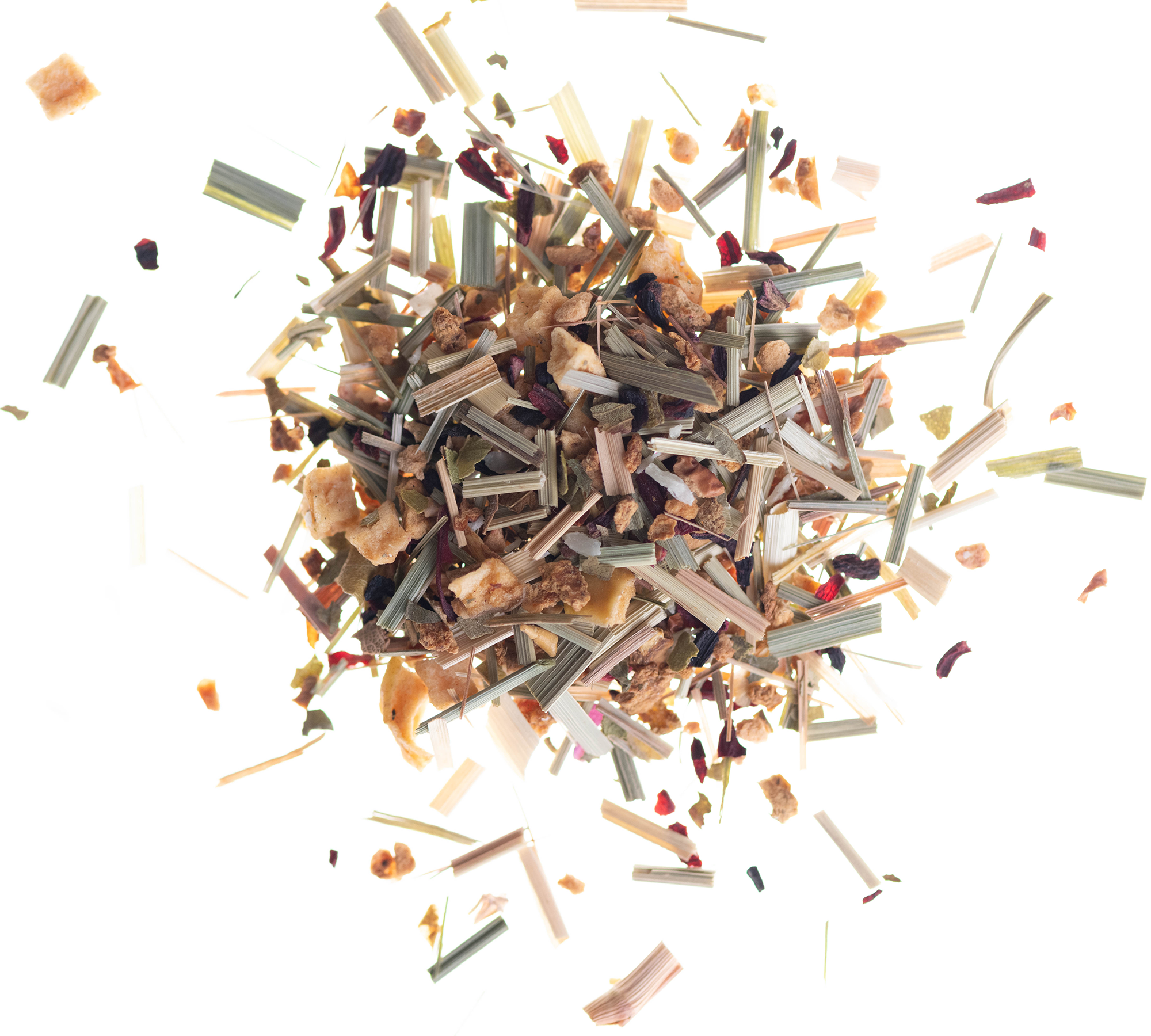 Apfelstücke, Lemongras, Hibiskusblüten, nat. Aroma, Kokosraspel, Brombeerblätter, Zitronenmyrte, Rosenblütenblätter
